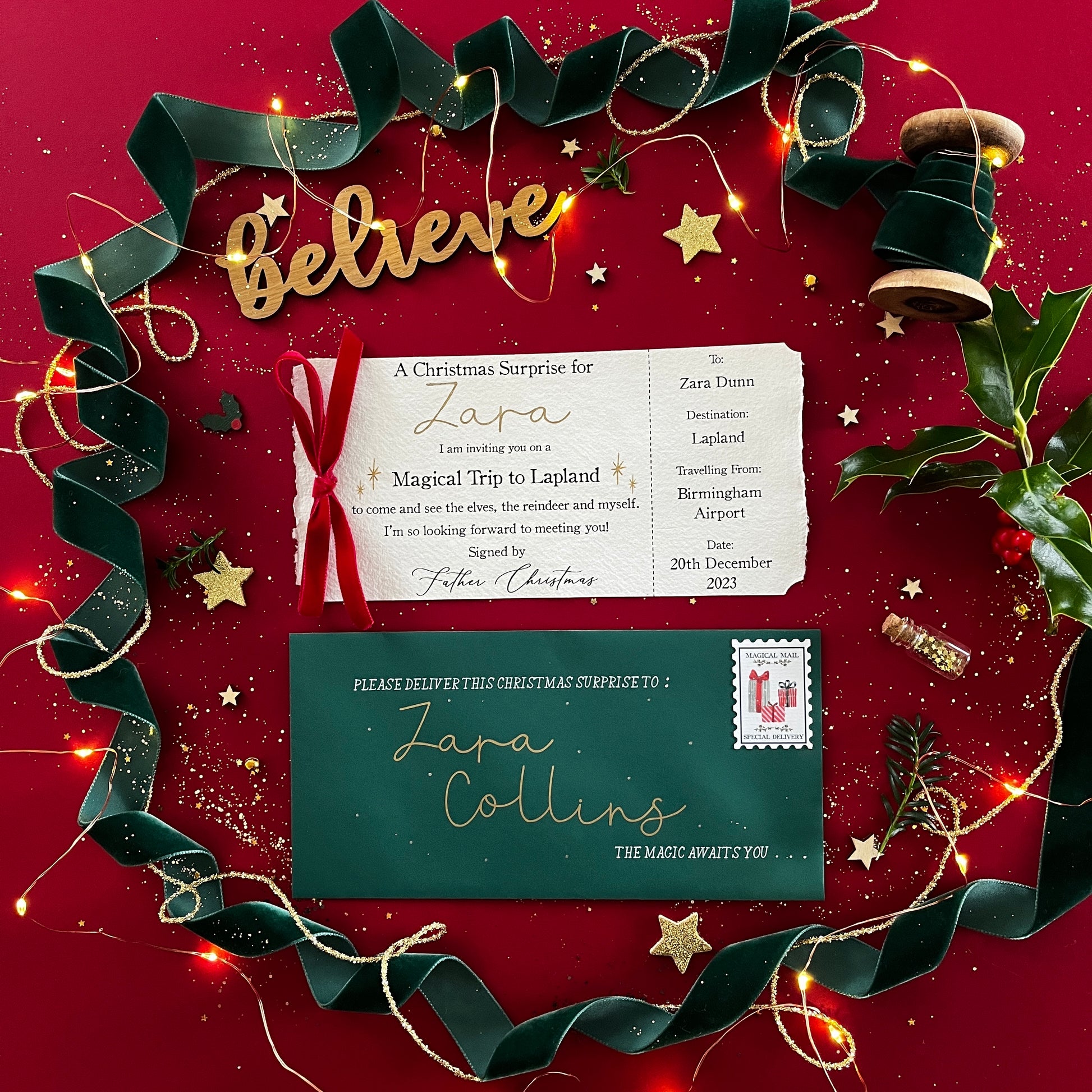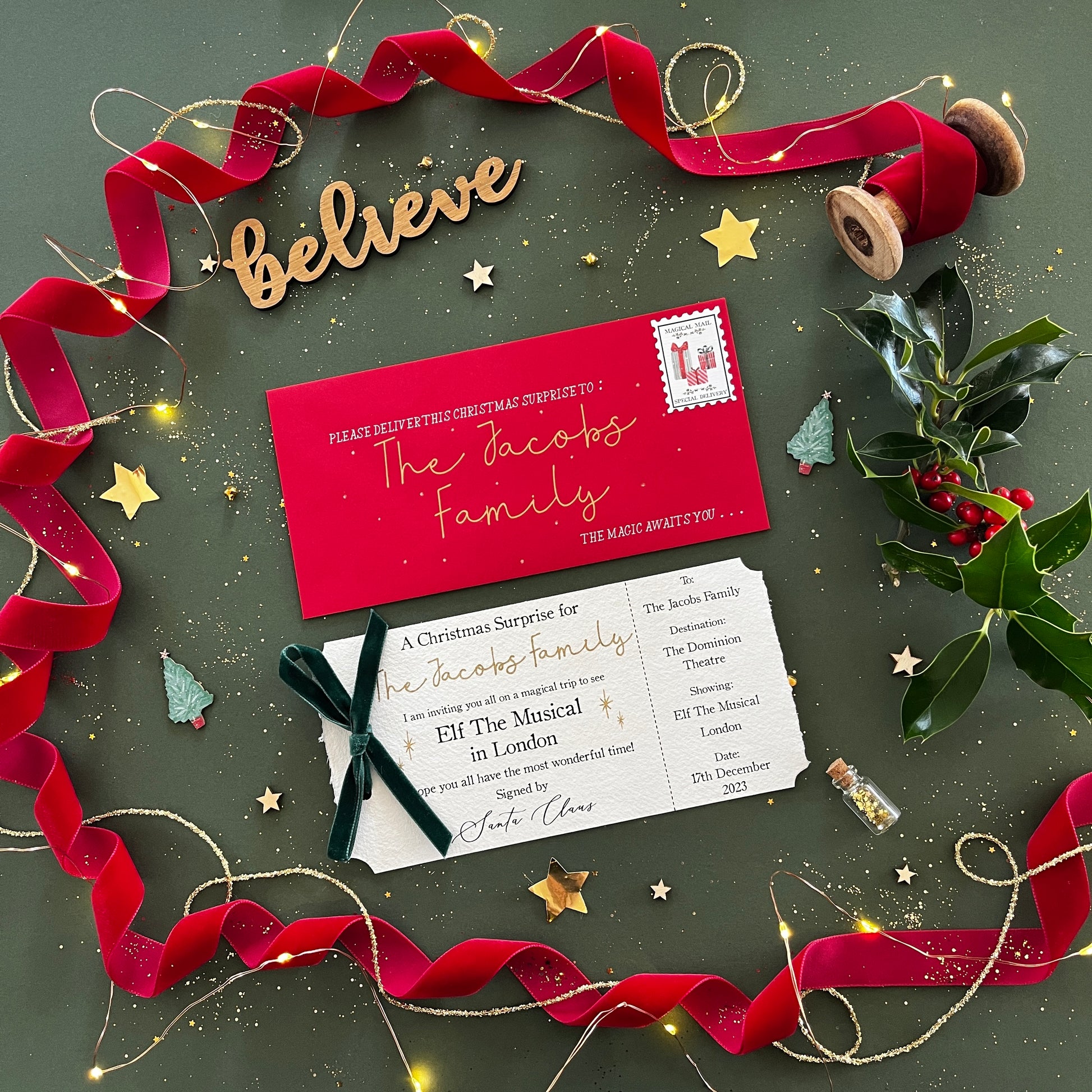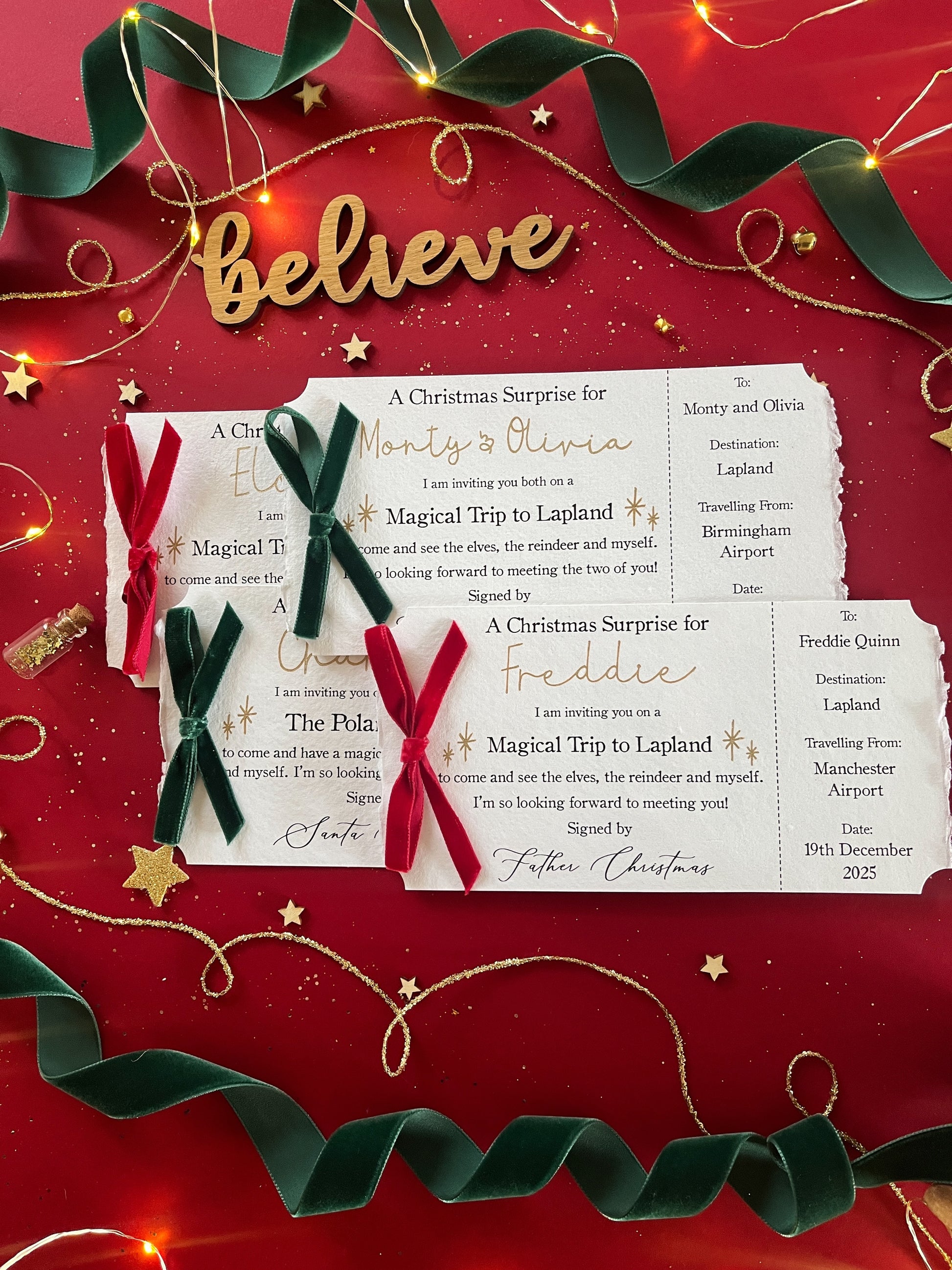 Tickets are printed onto handmade paper, with your child's name written in magical gold ink. Each ticket is hand-tied with a bow in our deep red or green velvet ribbon.