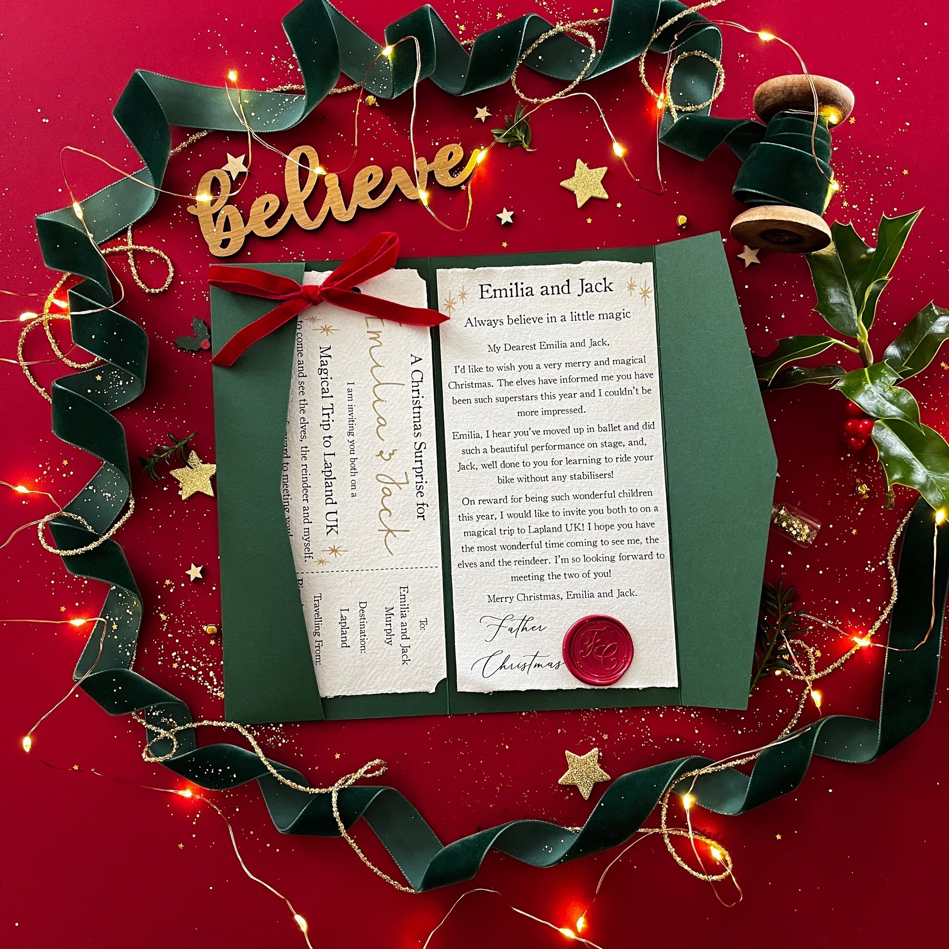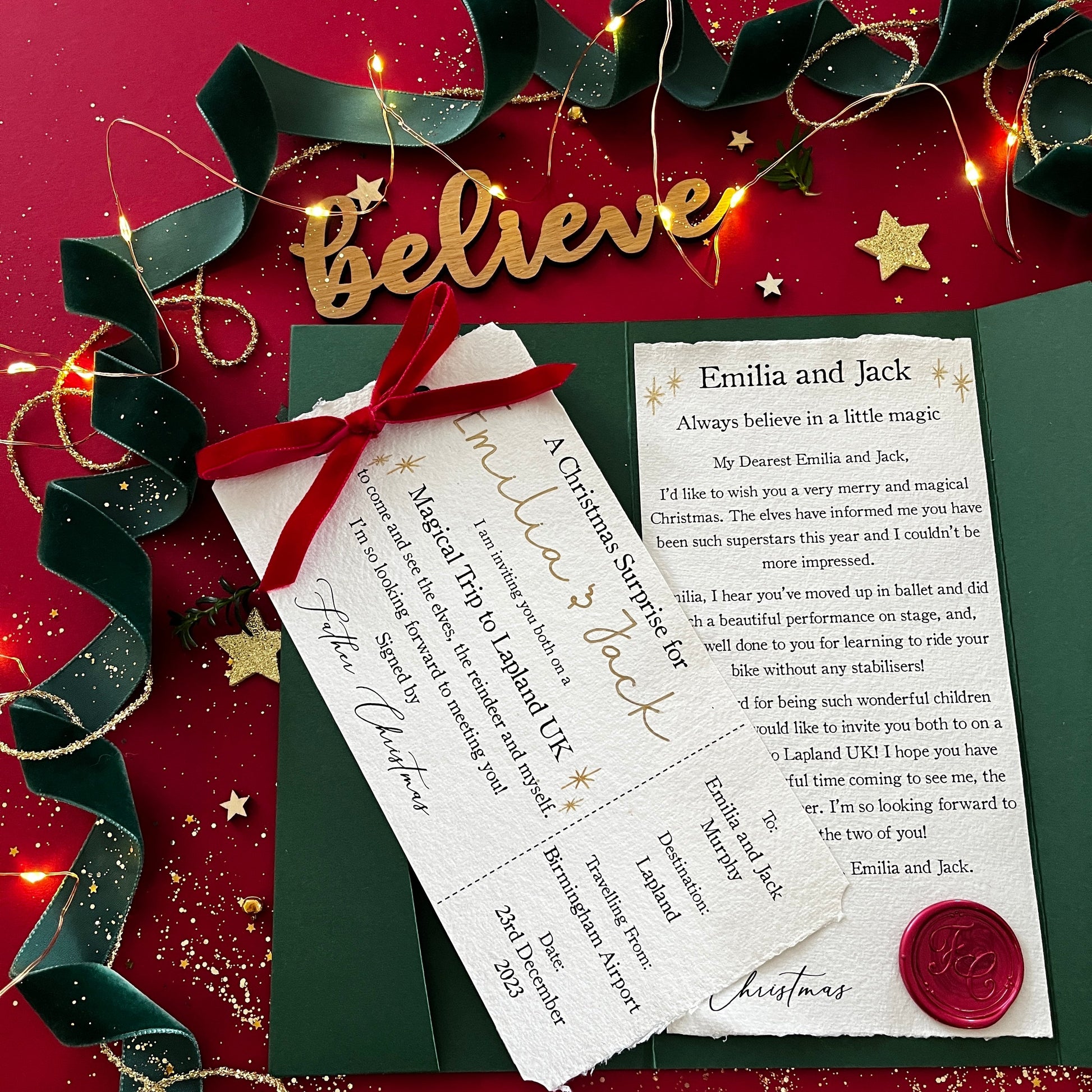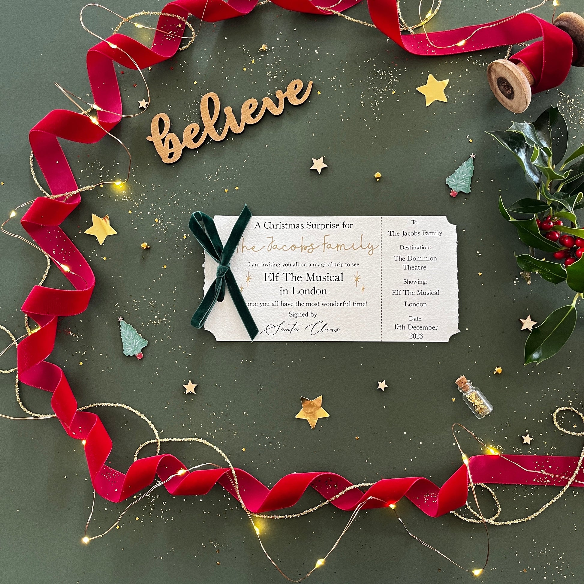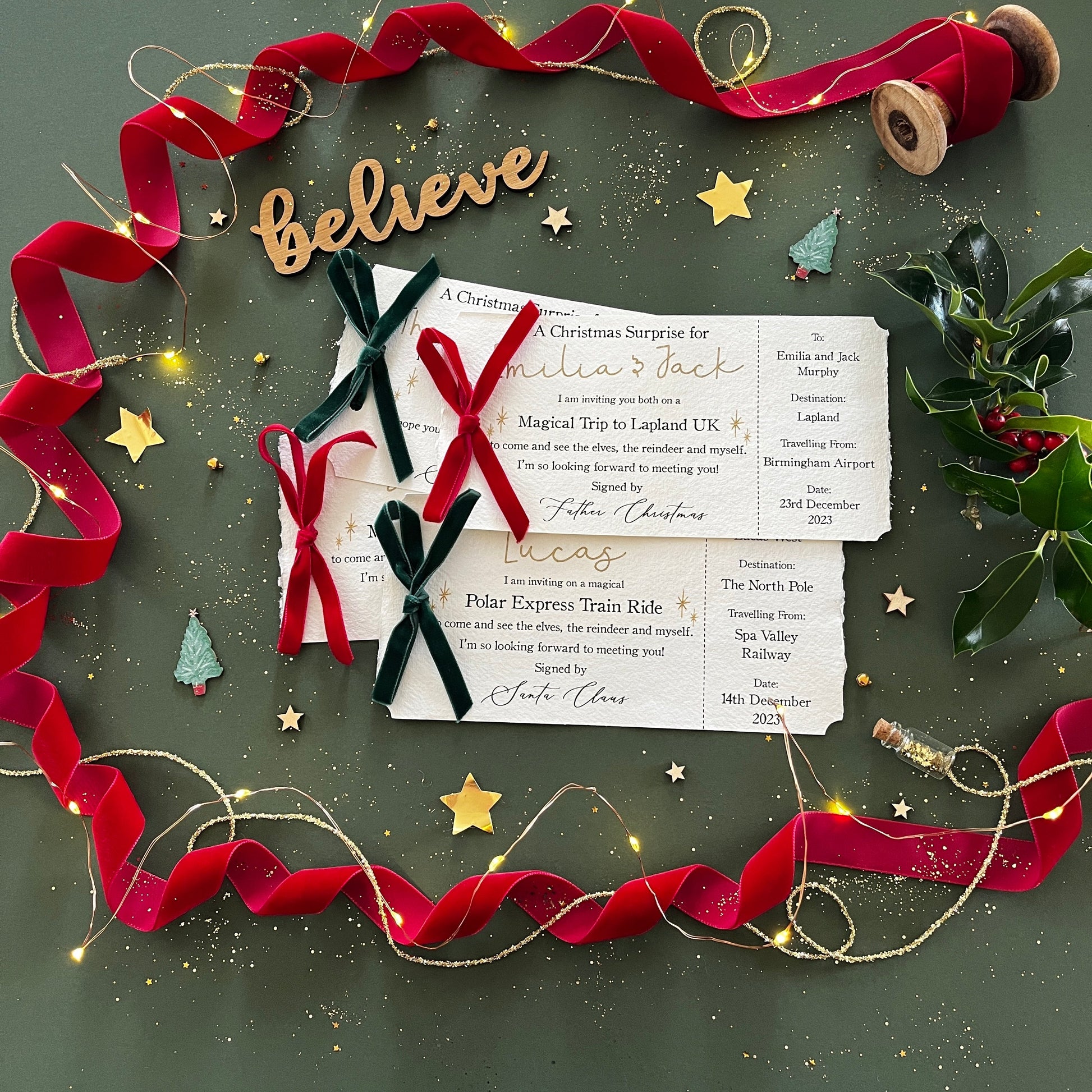 We can personalise this ticket to whatever you may have planned. A visit to see Father Christmas, a pantomime show, a steam train ride, or maybe even a magical trip to Lapland! Tickets are printed onto handmade paper, with your child's name written in magical gold ink. Each ticket is hand-tied with a bow in our deep red or green velvet ribbon.