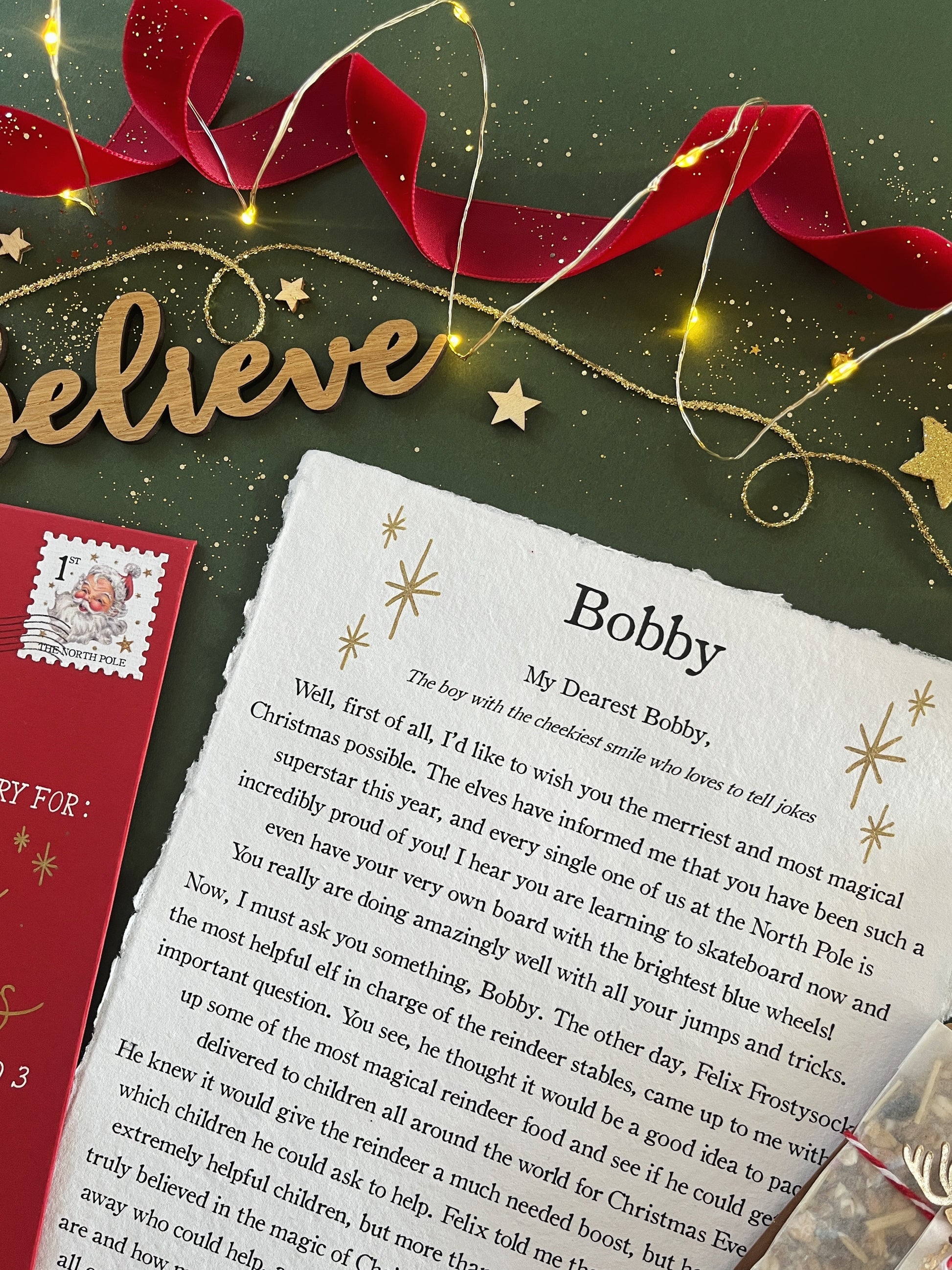 Printed on handmade paper, which is hand-finished with our official Father Christmas or Santa Claus wax stamp, our Reindeer Letters are designed to have the most traditional and magical feel possible. This letter will also include a packet of our Most Magical Reindeer food, and both will be enclosed within one of our string-tied envelopes, available in red or green.